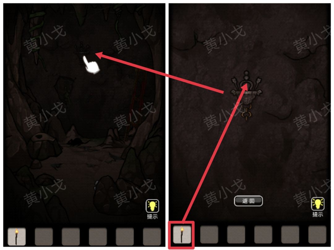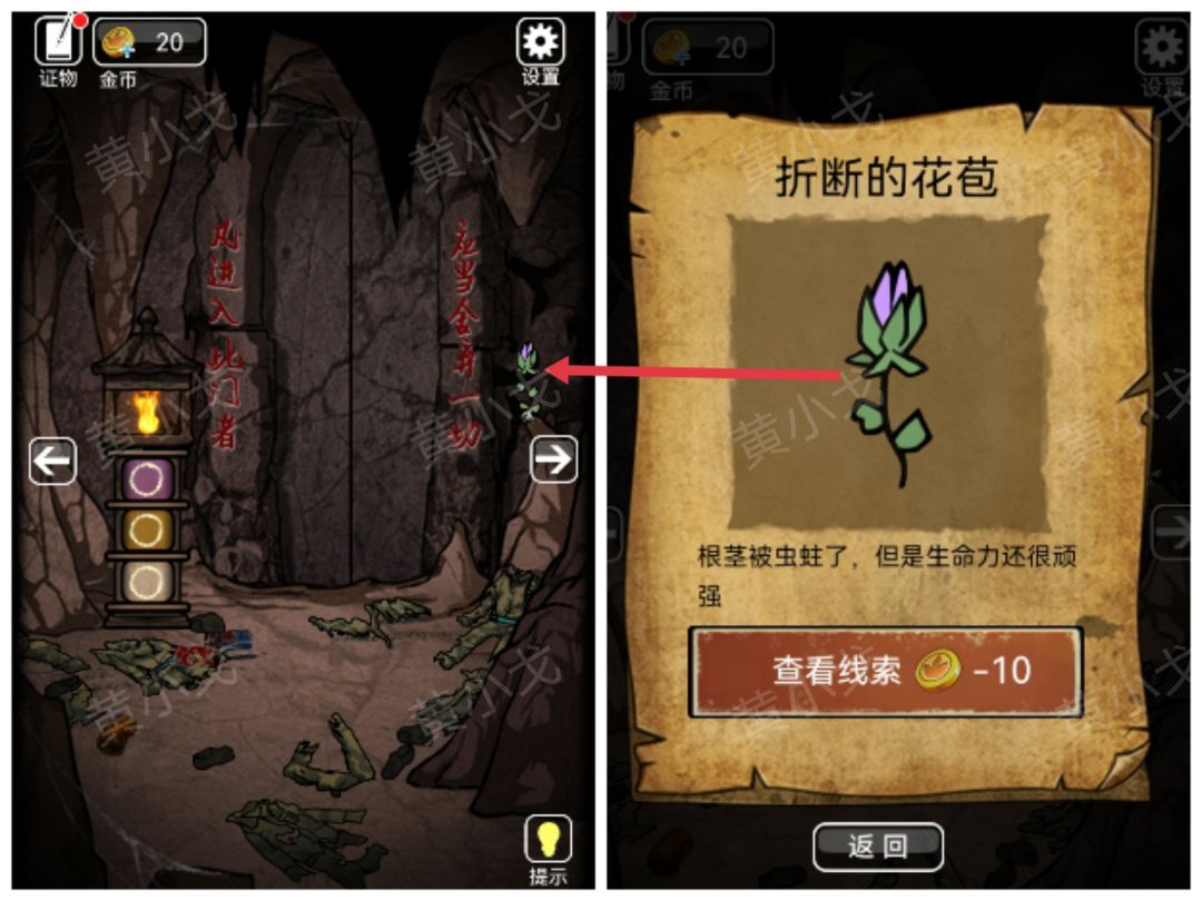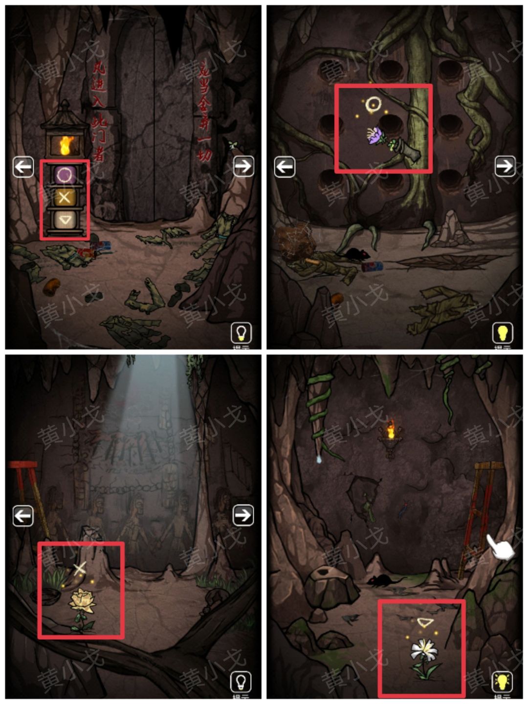 22.点击石柱机关,根据三色花上的符号线索和石柱的颜色,调整至对应的符号;打开石门