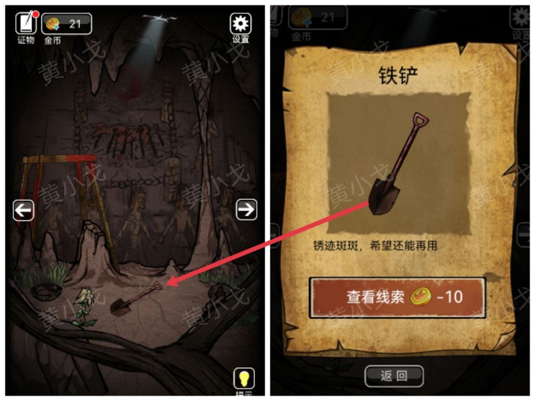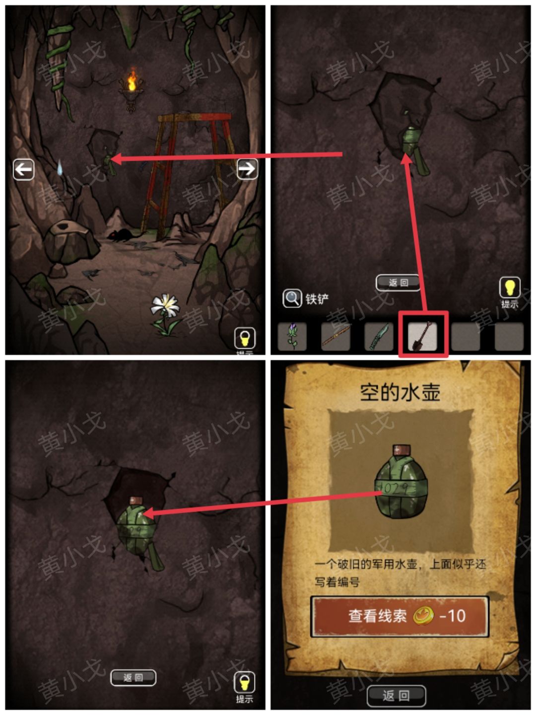 15.点击破损的墙壁,用【铁铲】挖开碎石,获得【空的水壶】