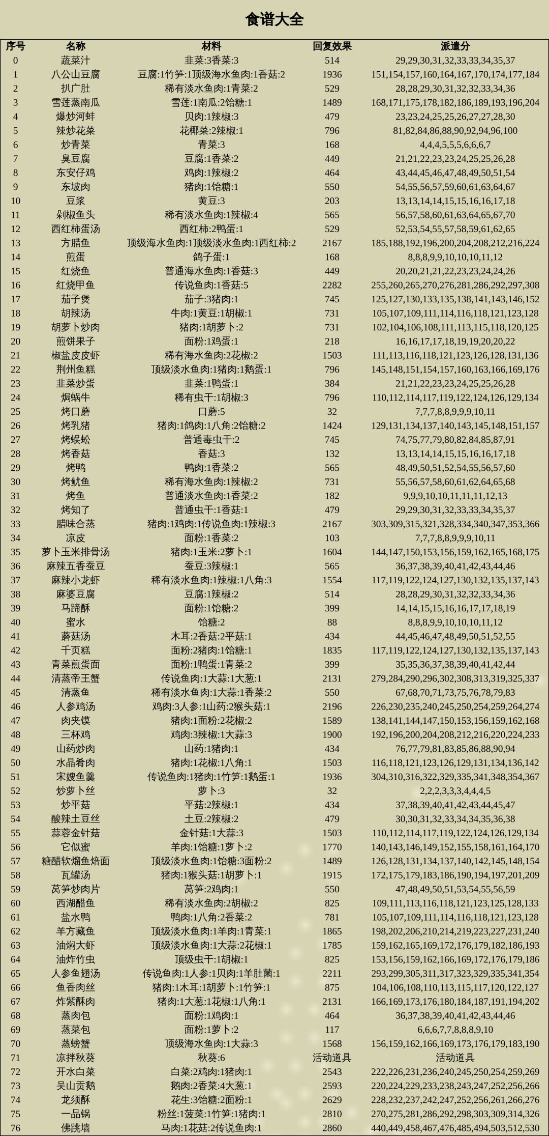 🍎关于烹饪炉子:萌新玩家在前期,明明已经有了菜谱里的所有食材,但是没有菜谱又该如何制作该菜肴?举个例子,如图三所示,正在制作龙须酥,原材料为花生+饴糖+面粉,当玩家有了这三样材料,而没有龙须酥菜谱时,无需硬等升级后赠送的菜谱道具,仅需在烹饪炉子里库存位置下方,手动选取并放入这三样材料,点击制作,制作出第一份龙须酥后,便会自动解锁龙须酥菜谱了。图四放了一份菜谱大全,萌新可以翻翻。