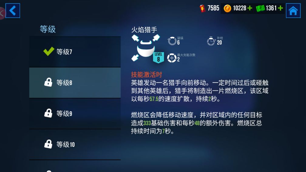神极发射了火焰猎手,这是一种在发射后或接触到其他英雄后一段时间内会形成点火区的装置。该区域会随时间而扩大。区域伤害分为主要伤害和附加伤害,主要伤害每秒增加附加伤害的值。燃烧区还会对护甲造成额外伤害,并减缓其中所有人的速度。