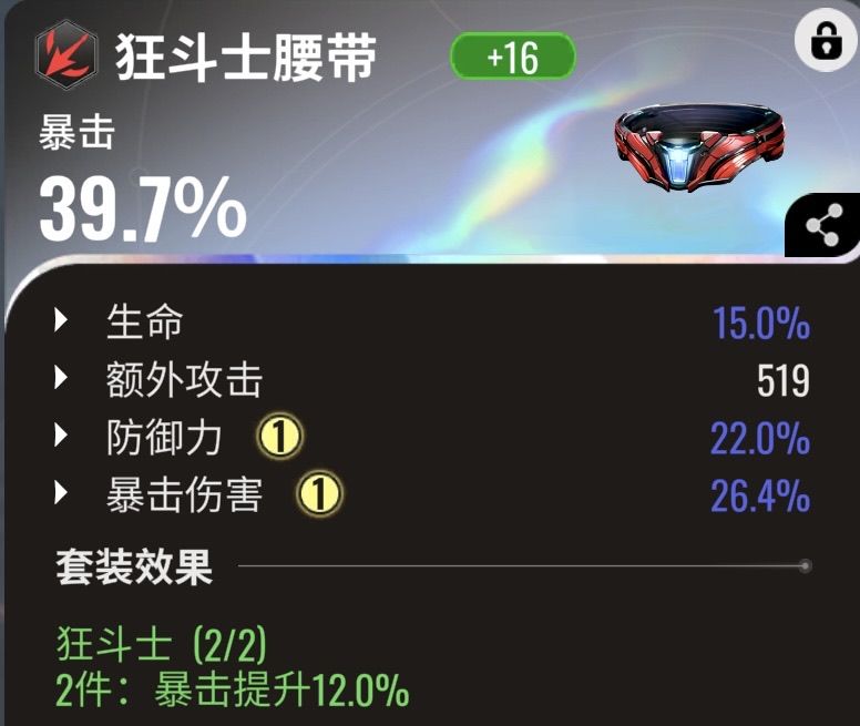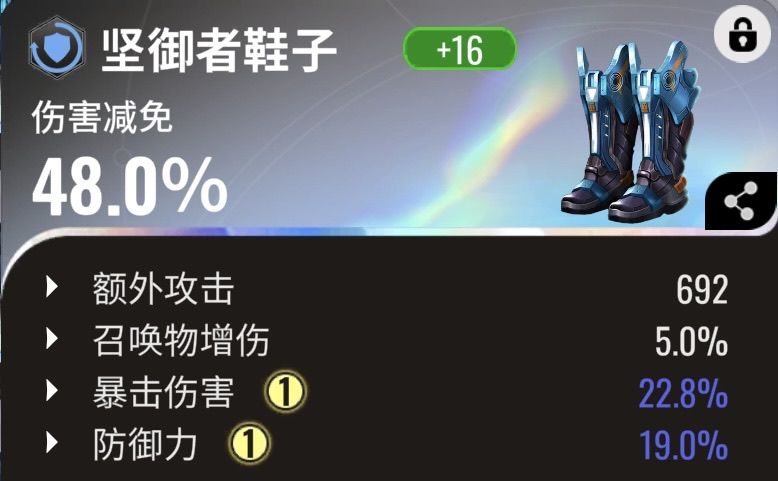 腰带主属性可这里还是建议双爆而不是防御,毕竟腰带位置是双爆的唯一出处。鞋子强烈推荐减伤鞋子,不过减伤鞋子想再出防御力%、暴击%、暴击伤害%这三条副属性是比较难得,可以勉强少一条先用着。