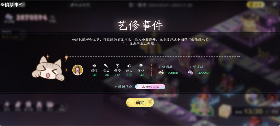 玩法类收益:营业额、艺人属性、各类增益卡(使用后可增加颜值、舞姿等点数)、饭团数、解锁词条等。