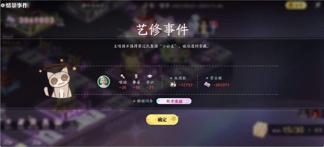 ●因沉迷燕尔牌,严重影响作息,熬出了黑眼圈。艺人发生负面事件,会扣除艺人属性、饭团数及营业额。