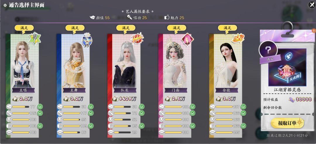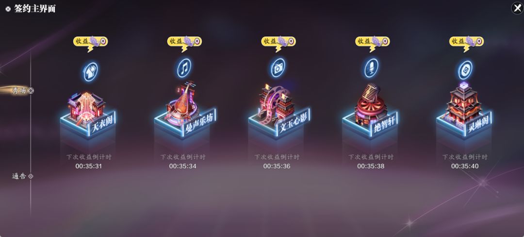 通告多多,收益多多。天衣阁、曼声乐坊、文玉心影、绝智轩、灵琳阁分别向旗下艺人抛来橄榄枝,选择适合的艺人签约获取收益吧!