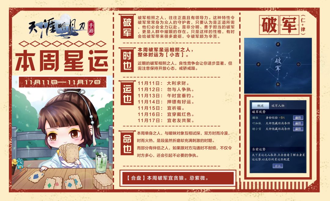 本周星运为破军的少侠,整体时运为【小吉】。本周少侠是不是处在竞争之中呢?良性竞争会使少侠得到显著的进步,所以请少侠不要焦虑急躁,以开放的心态面对,一定会取得好的结果的!