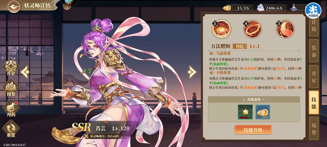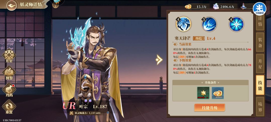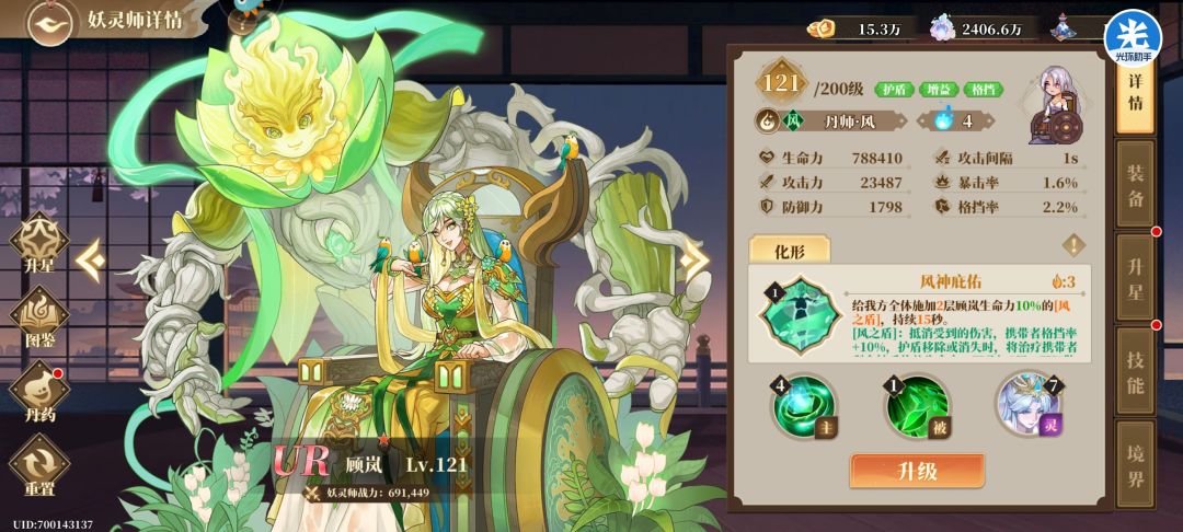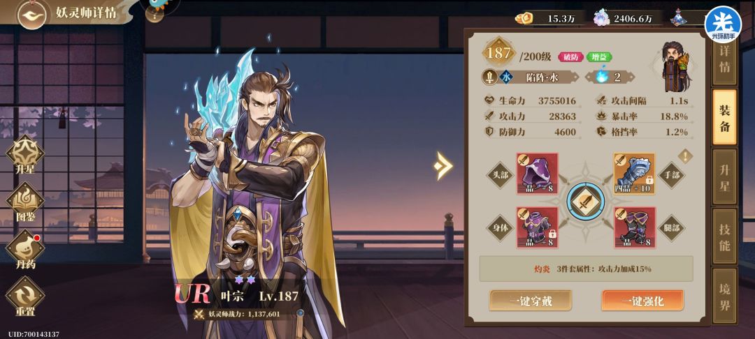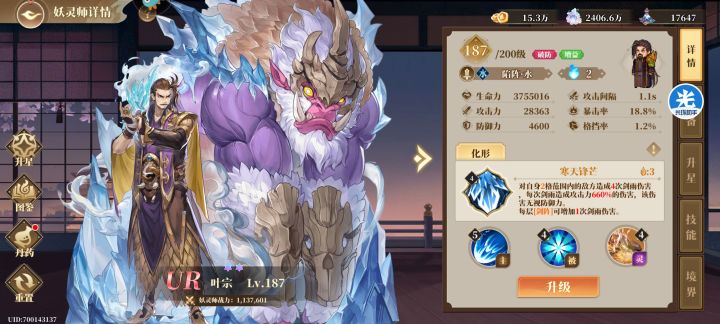 叶宗上下限都很高,大号13星叶宗能过深渊,最后三层无复活,一次过。这个小号如上面板能过装备17,18很快也能过,对0氪十分友好,叶宗对单对群都很优秀。