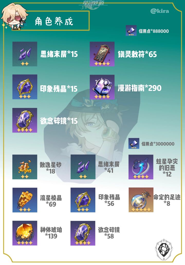 如图所示的是升满等级和行迹的材料!!需要打的周本是在禁闭舱段的「蛀星的旧靥」!