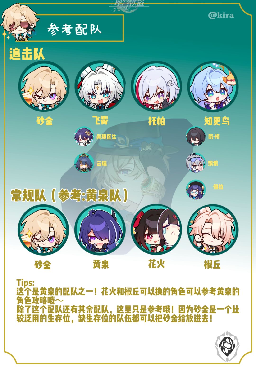 除了这个配队还有其余配队,这里只是参考哦!因为砂金是一个比较泛用的生存位,缺生存位的队伍都可以把砂金给放进去!
