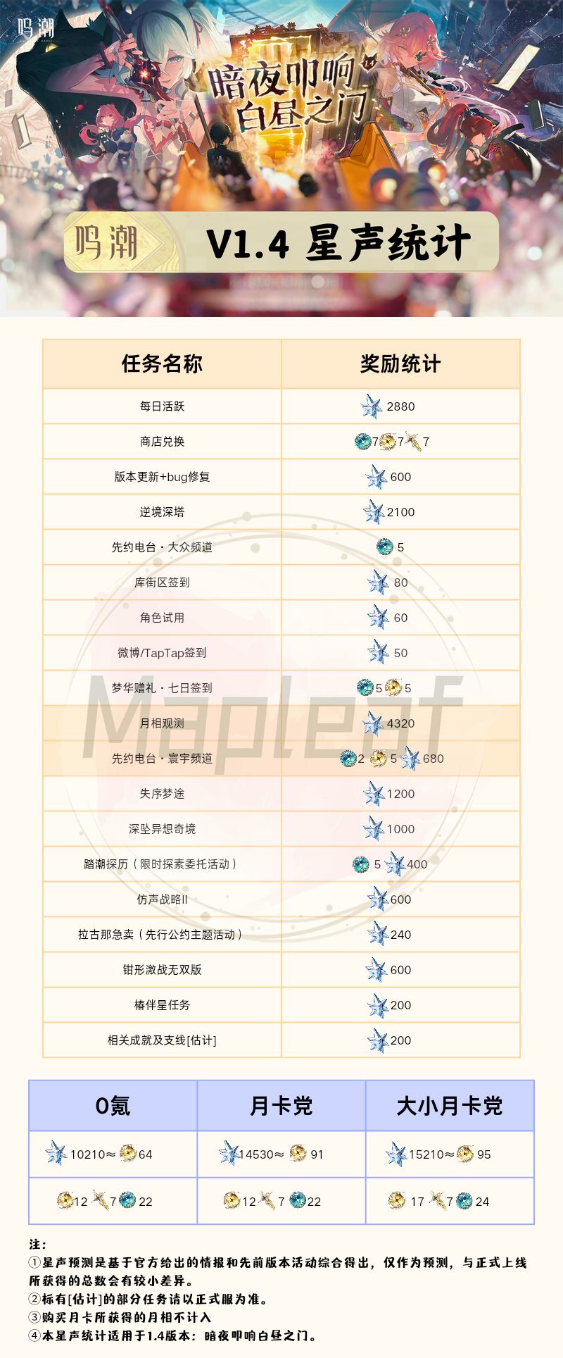 漂泊者早上中午晚上好啊,这里是枫叶,本期给大家带来的是1.4版本「暗夜叩响白昼之门」星声统计~