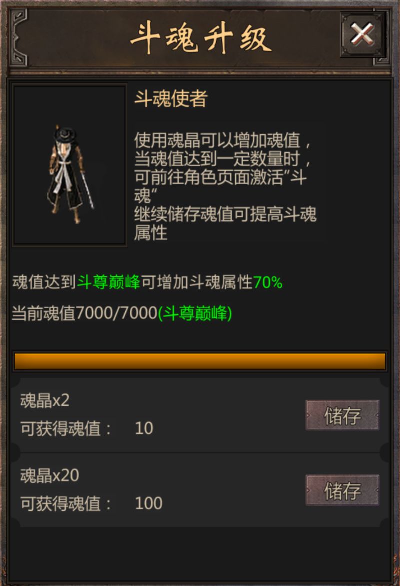 斗魂前期收益不高,且解锁需要一定门槛,属于是中后期玩法。魂晶本身可以使用20个玄玉进行兑换。2魂晶等于10点魂值。魂值上限为7000点,所以总计是1400魂晶。开启功能是1000点也就是需要200魂晶。推荐使用无法放入图鉴的装备,有多的一套高级装备也可以放,装备的基础属性越高,增幅玩家的量就越多,到达满级后可为角色面板提供70%的斗魂属性。