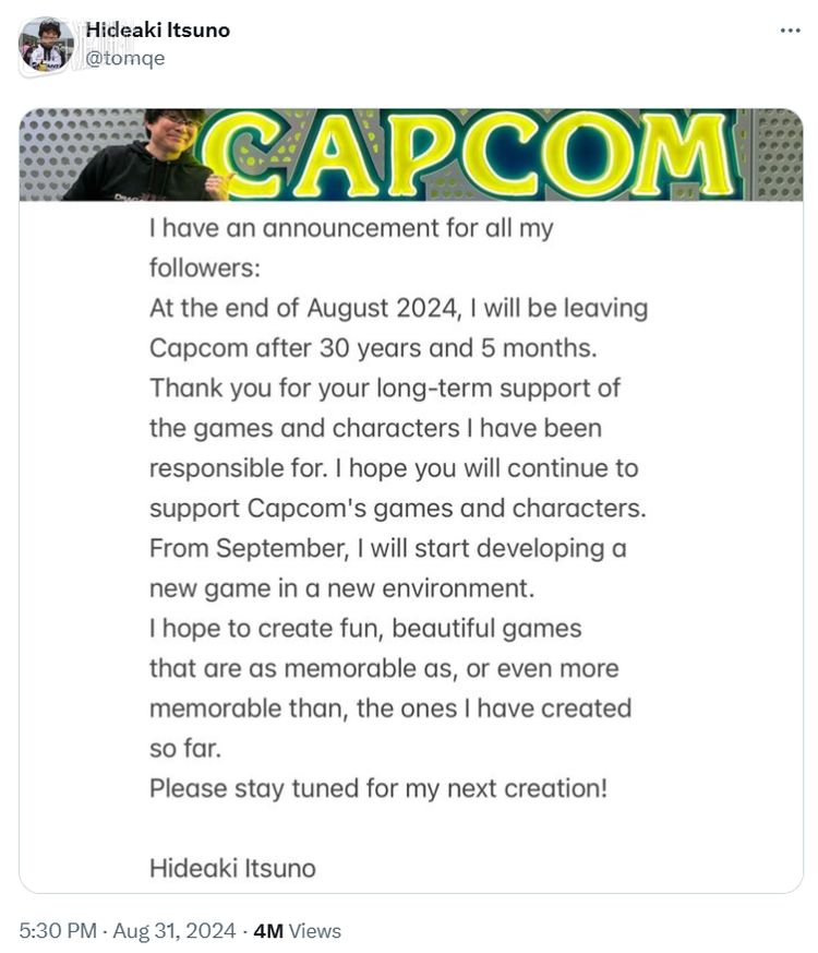 今年8月31日,曾参与开发《鬼泣》《龙之信条》等知名游戏的伊津野英昭突然宣布自己将从卡普空离职,即将去往新环境着手开发新作品。
