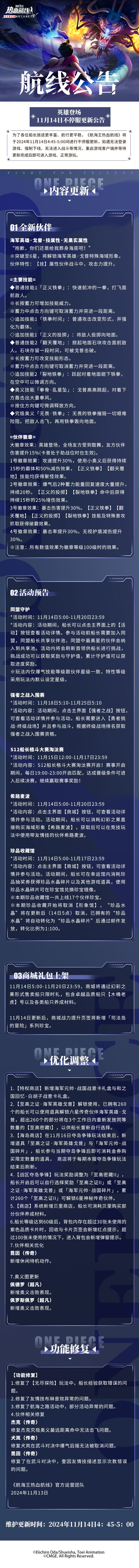 为了各位船长旅途更丰富、航行更平稳,《航海王热血航线》将于2024年11月14日4:45-5:00间进行不停服更新,如遇无法登录游戏、强制下线、无法进入战斗等情况,重启游戏客户端并等待更新完成后即可进入游戏、正常游玩。