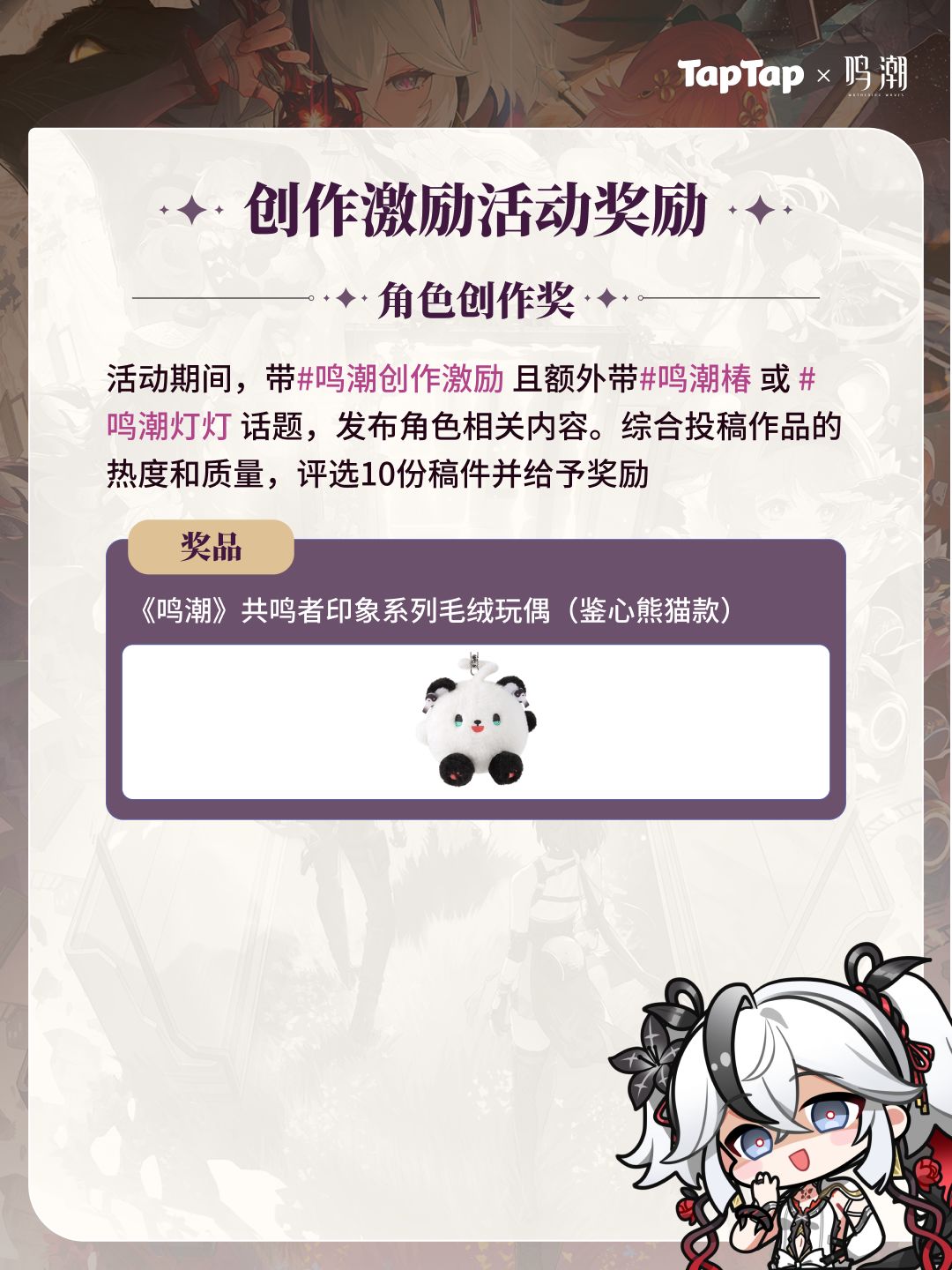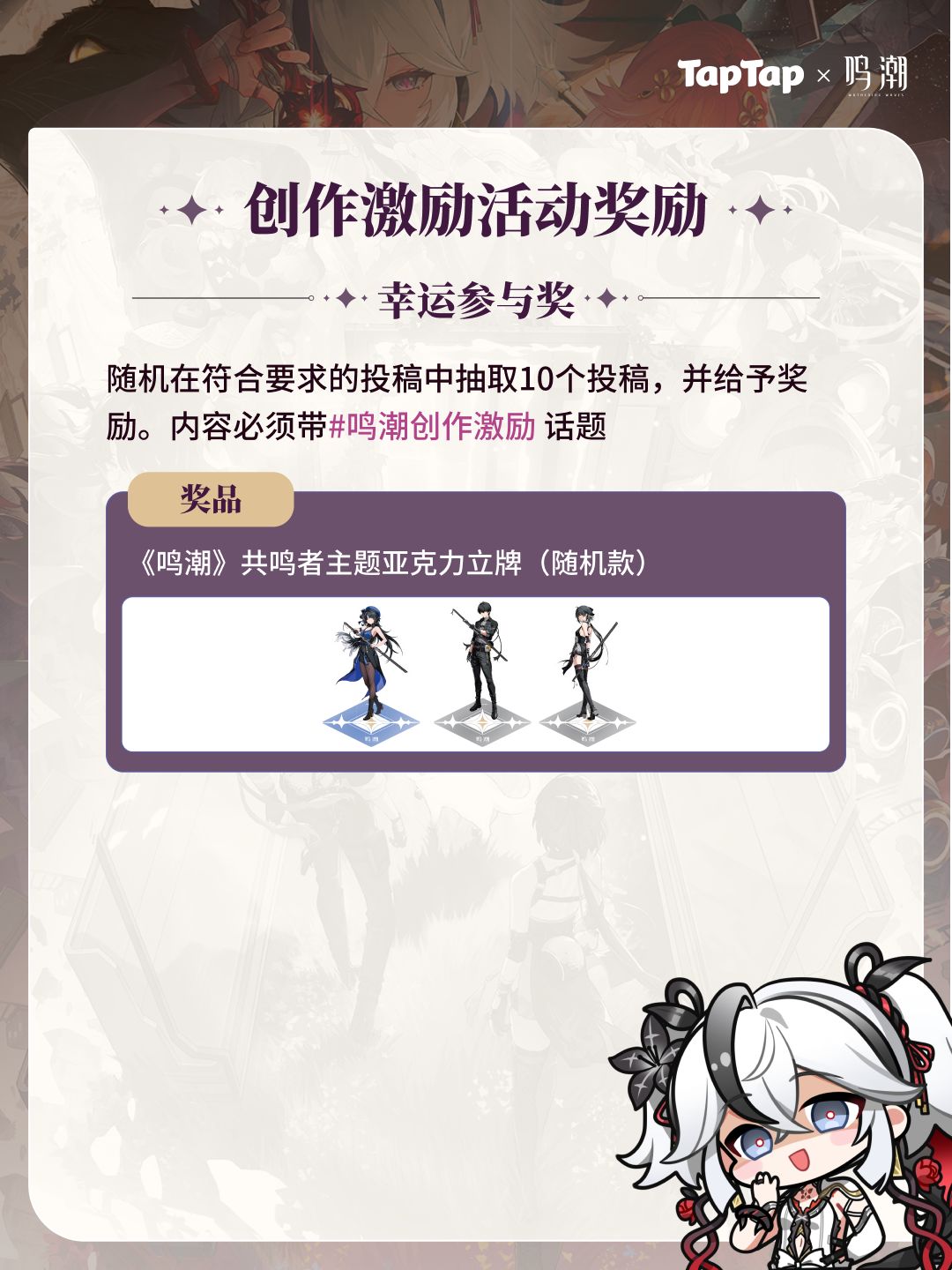 随机在符合要求的投稿中抽选10个投稿,并给予「共鸣者主题亚克力立牌(随机款)」。内容必须带#鸣潮创作激励 话题
