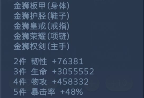 简单计算可得,两件套的金狮可以获得76381×2.85=217685.85点物防,但是三件套可以加3055552血量!