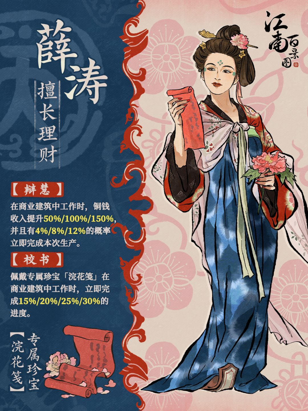 11月14日起,全新天级居民「薛涛」入驻「锦书画池」,知府大人可前往 #江南百景图 绘画获取。