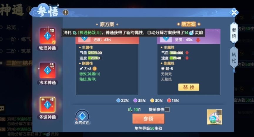 普通抽取和灵韵,出红色神通几率对比
