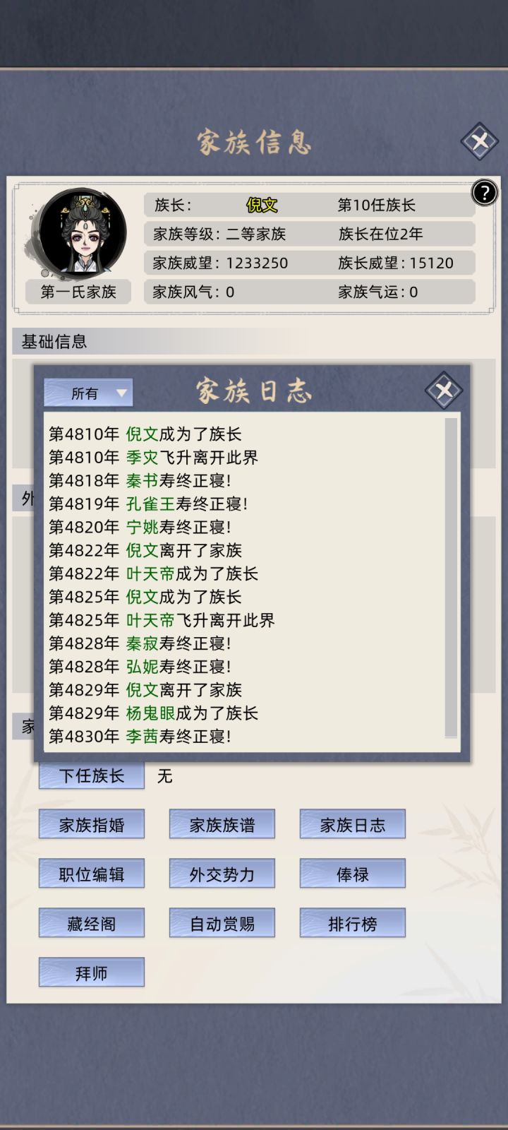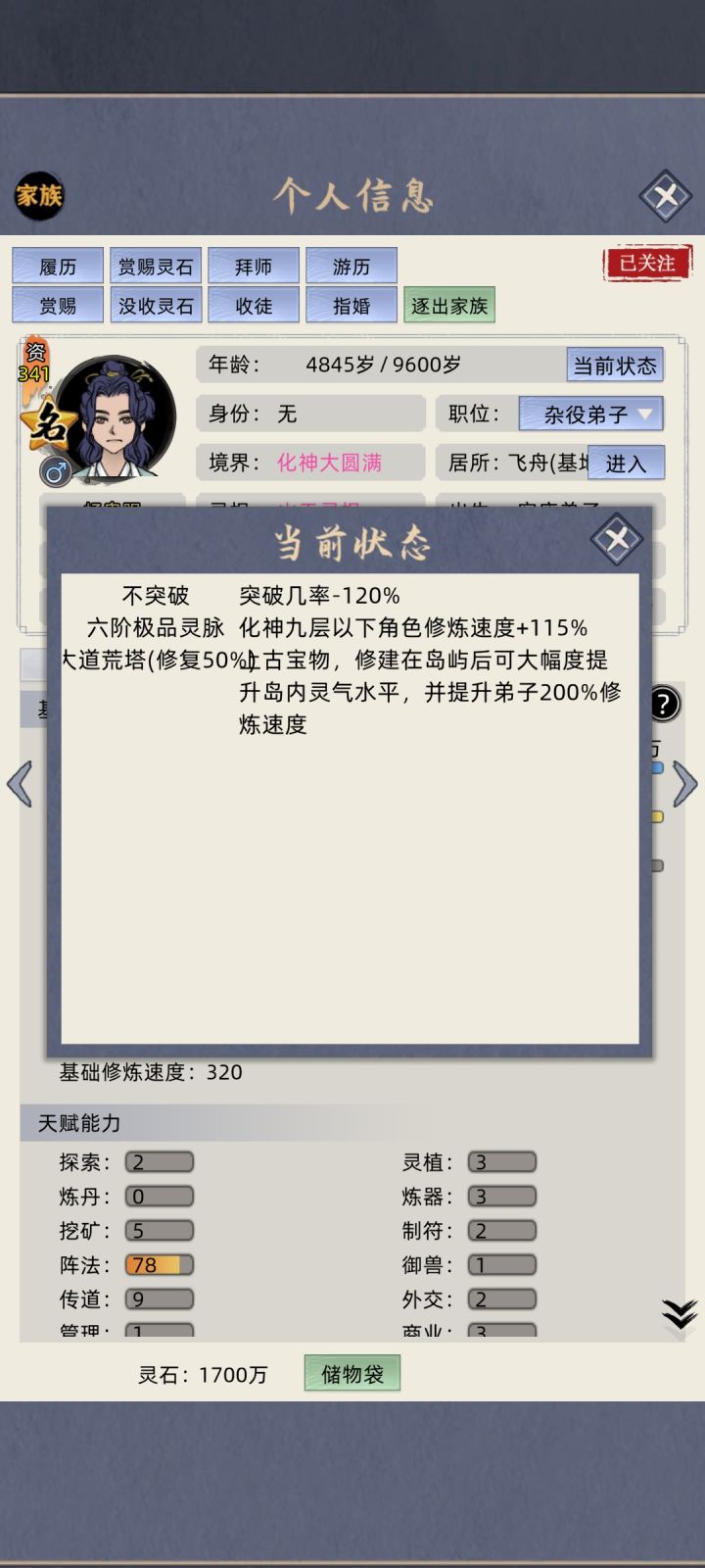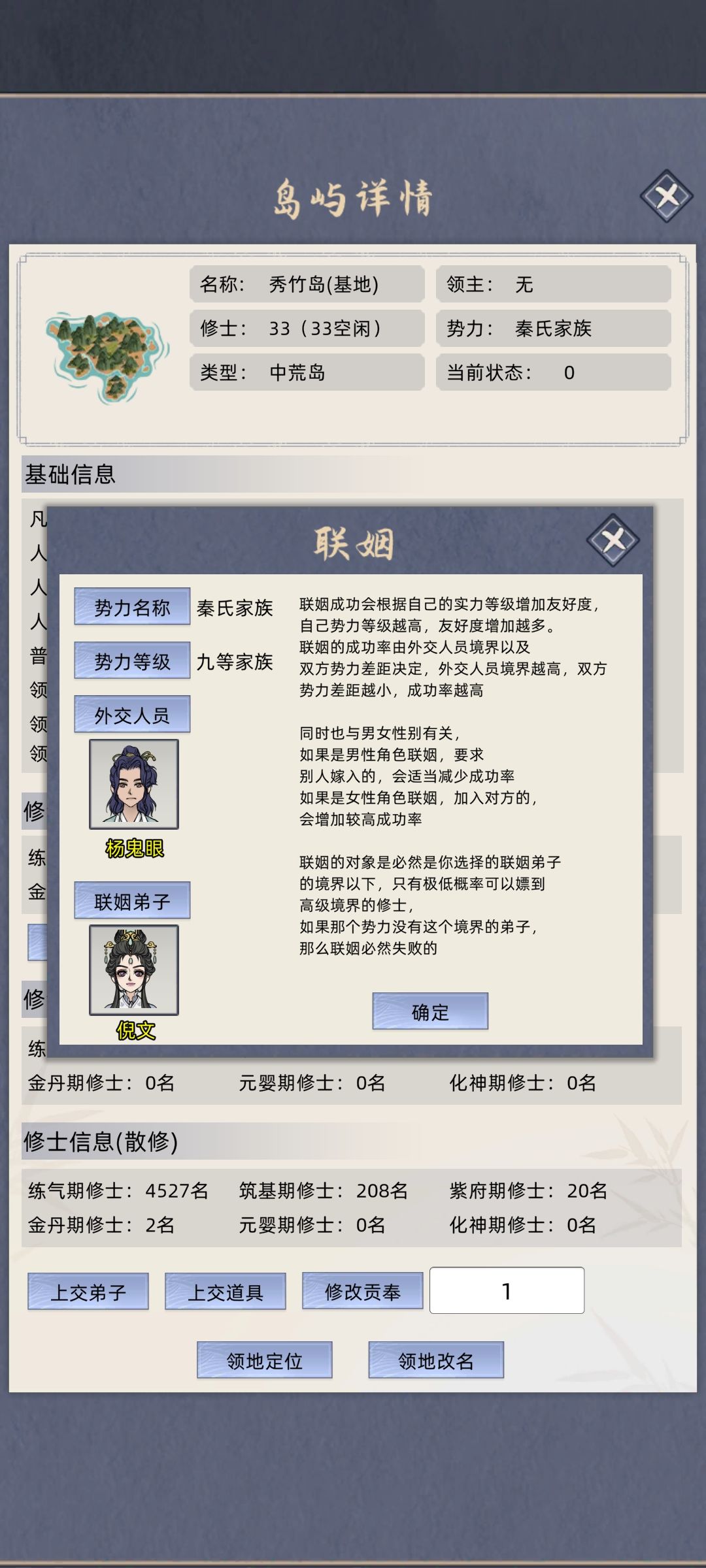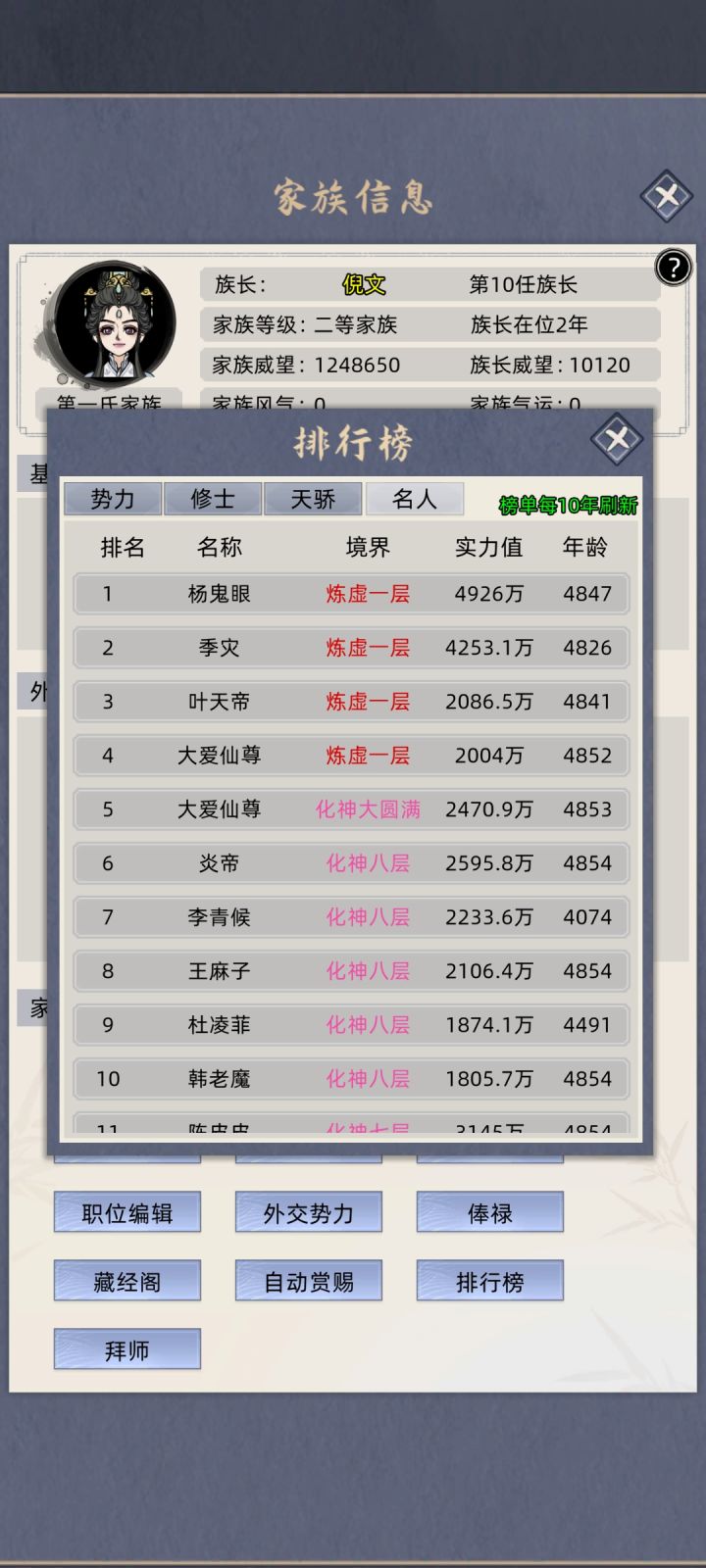 补充一下抓名人的方式,找到名人的岛屿,查看家族等级,自己的家族等级必须比名人的高,然后征服——掠夺——征服,一般就变附属势力了,然后送灵石2/5亿,暂停时间,上交元婴/化神。然后先赏赐点东西,存档,退出游戏,重进【名人一年不跑】,把女族长嫁出去,让名人当族长,这样名人就不会跑了。最后在找那个附属势力上贡灵石2/5亿,这样就白嫖了。
