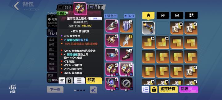 灵戒底子相对于其他底子,打不出暴击值,暴击伤害,元素穿透等有用词条,但是刚需的聚能上限,智慧在前缀是可以打出来的,元素穿透换护盾上限,既提高了生存,还降低了打造成本,并且众所周知元素穿透是会被稀释的,所以我只在一个戒指上边打了。