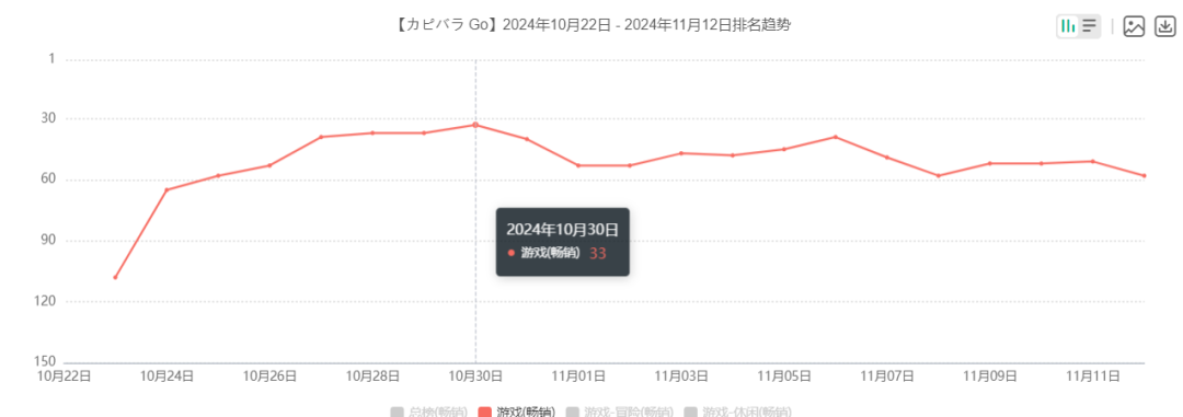 第三梯队当中,日本本土产品《MLB PRO SPIRIT》是KONAMI出品的棒球题材产品,虽然能冲到畅销榜第10位的高度,但波动幅度较大。紫龙游戏的《钢岚》在日本市场开服冲到畅销榜25位,不过后续一路走低,还要看新版本是否有抬头的趋势。HABBY全球发行的《卡皮巴拉Go!》于多个地区闯进畅销TOP10,而在日本地区则徘徊在畅销榜30~60的区间,有点慢热。