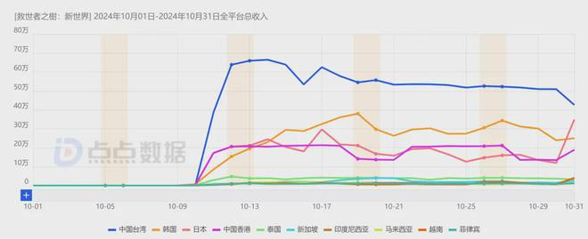 《救世者之树:新世界》上线后,快速横扫港澳台市场,登顶当地iOS畅销榜首,并在月末冲到韩国市场iOS畅销榜第三位、日本iOS畅销榜第10位。收入数据方面,10月这款游戏的总流水约为1.97亿元,日本市场占比排第三。