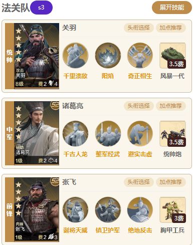 首先是法关羽队,法关队由关羽,诸葛亮,张飞组成,法关队克制反击队,关羽带阳焰和奇正相生,诸葛亮带整军经武和避实击虚,张飞带镇卫护军和绝地反击。