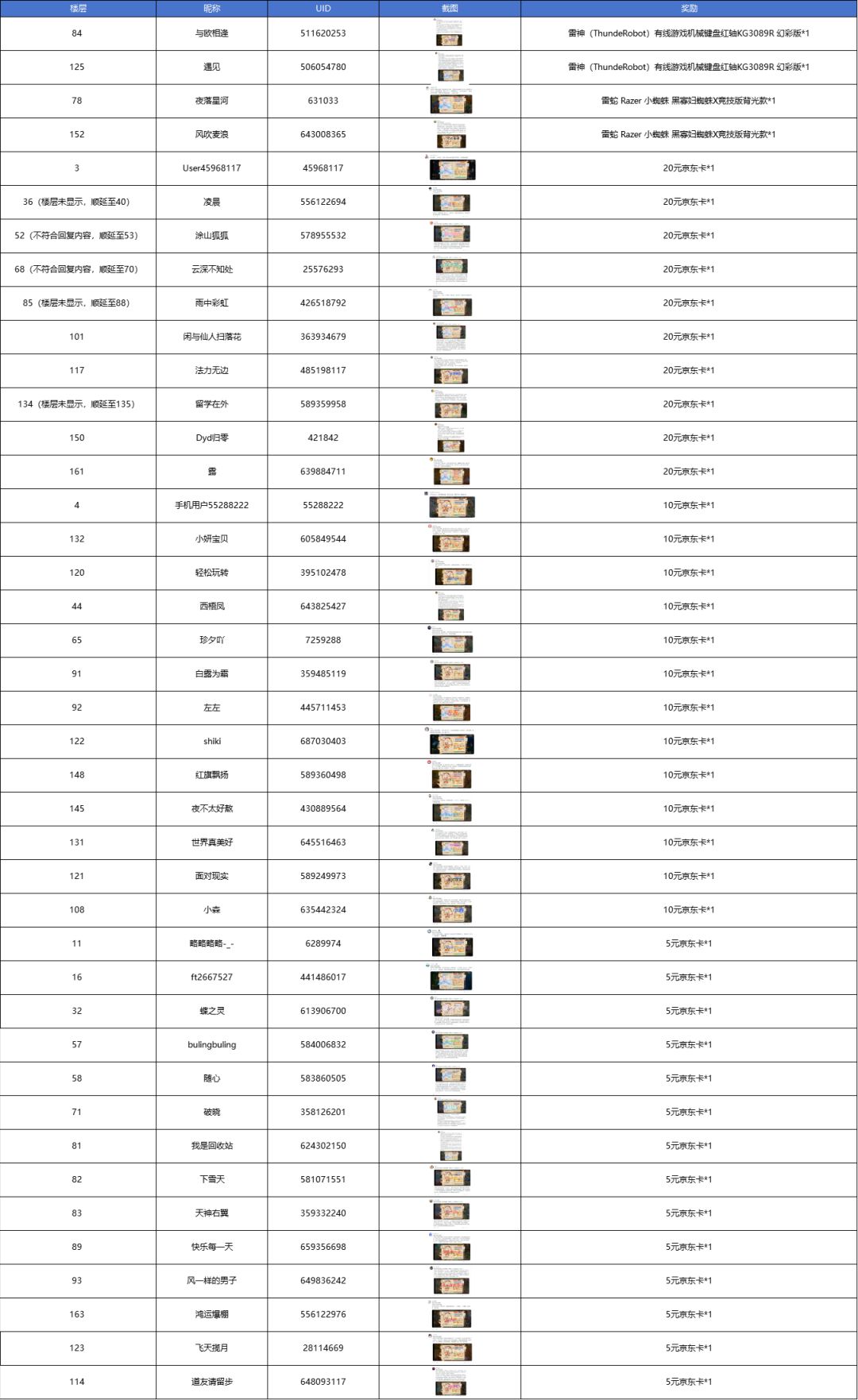 活动期间,因接到玩家投诉,我们逐一进行了查证,存在多 IP 多账号刷楼、控楼的情况,故此次奖励减半发放,还请按照活动规则参与,不要违规哦~此次活动中,因个别楼层有重复获奖的玩家,根据规则同一玩家只能中奖1次,故名单顺延。
