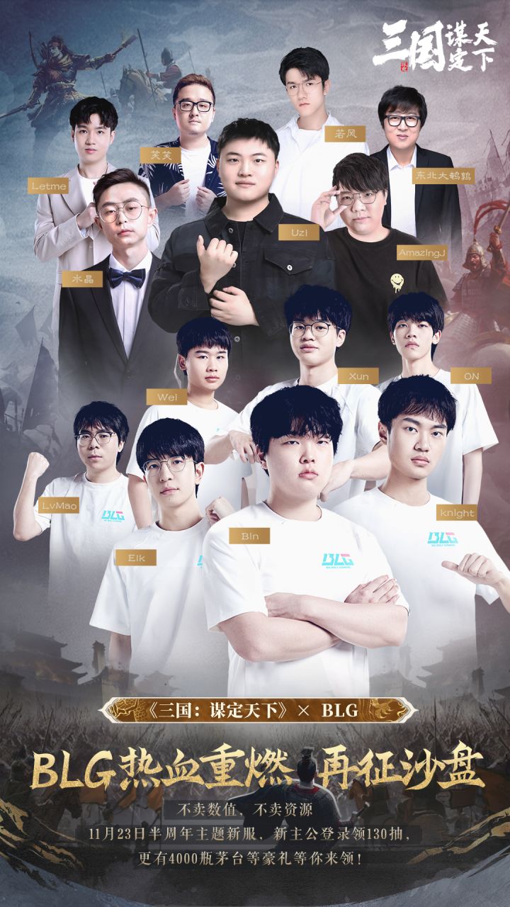 国人三国游戏《三国:谋定天下》X 全华班BLG战队联动正式开启!11月23日,BLG战队及一众人气主播,入驻半周年主题服【群星闪耀】,带主公一起打天下,赢千瓶茅台!