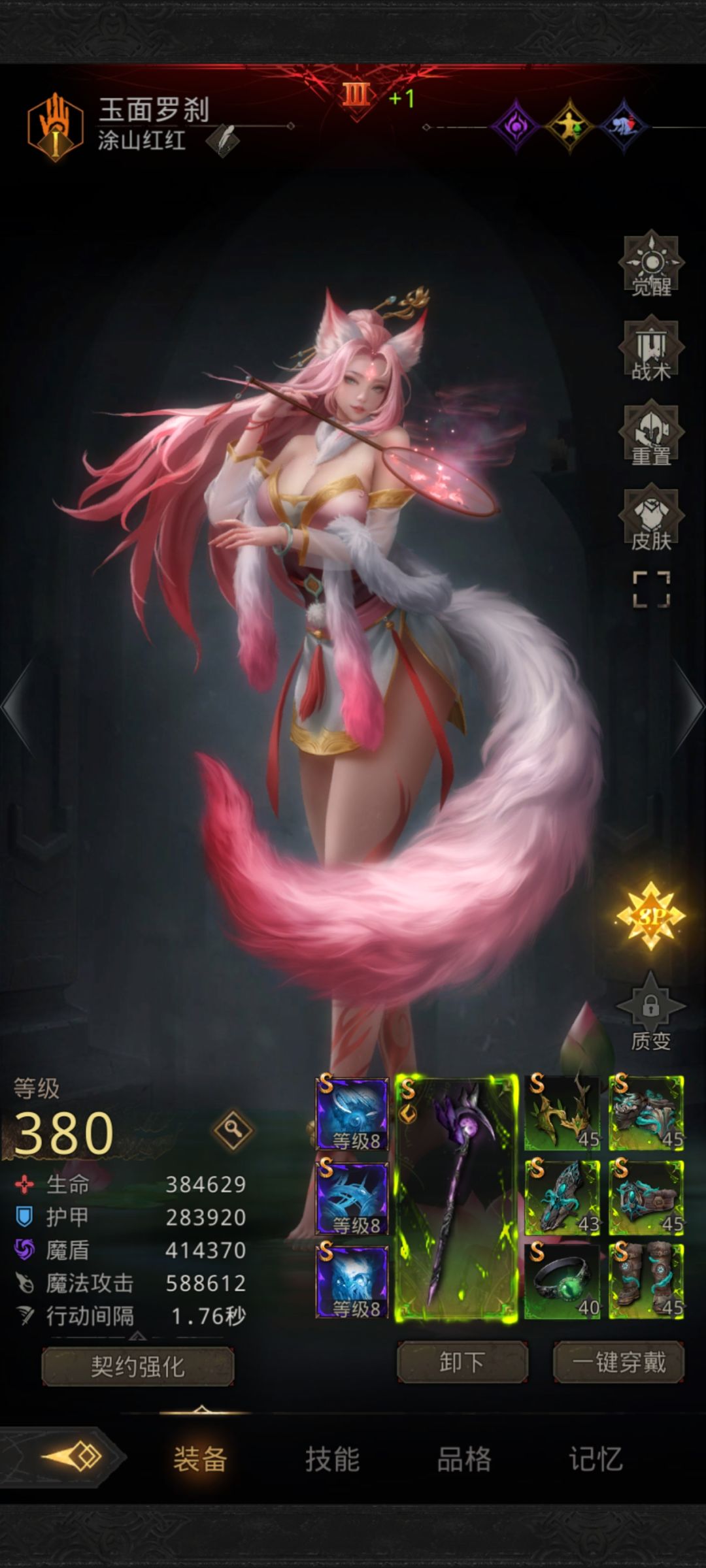 狐狸(多功能工具人)武器:双鹰手杖、符文巫咒,防具:飞翼套+结晶甲。饰品:毒戒指,魔物CD+承伤。