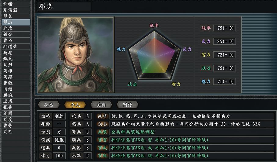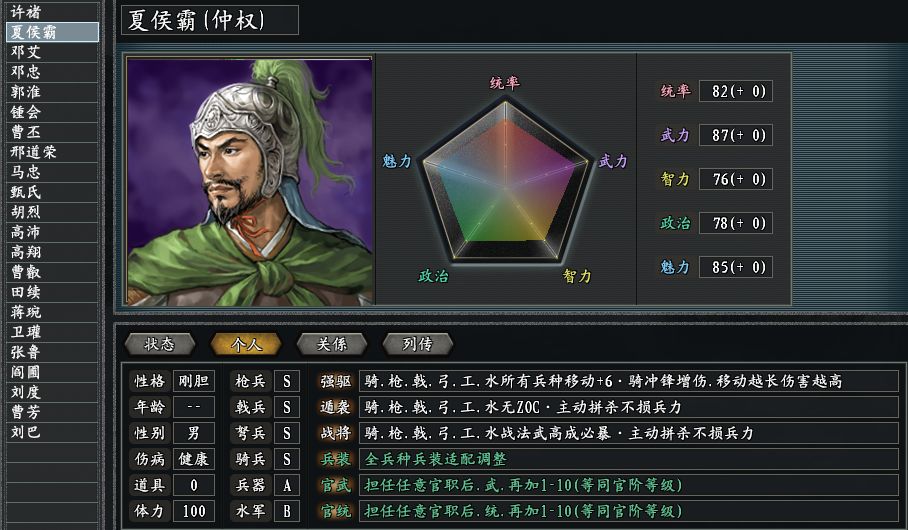 进攻方面有双前锋,夏侯渊的儿子夏侯霸和邓艾的儿子邓忠。其中夏侯霸明显更是善于骑兵,强驱、遁袭配战将,可比原版那个只懂跑路的自己强太多了!老爸夏侯渊看了也会相当欣慰,因为儿子兼容了他的突袭和刘备的遁走,更有概率冲锋撞伤敌人。邓忠的战斗技能有战将和众志,依旧是最推荐带领枪兵出战,三国志11惊鸿版的邓忠,凭借众志规避兵种相克效果,还能节省气力消耗。
