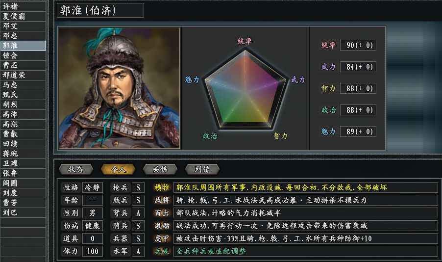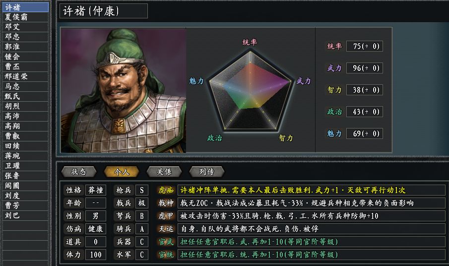 战场上的肉盾型人才,三国志11惊鸿版也给曹丕指派了两个,分别是虎痴许褚和御蜀屏障郭淮。版本新增的虎甲技能,基础减伤幅度达到了33%,对于全体兵种也都有额外防护效果。一个武力爆表,一个智商在线,扼守险要就仰仗他们了。