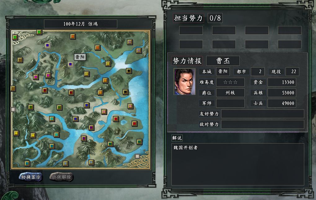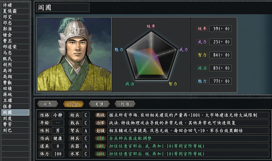 曹丕势力在三国志11惊鸿版的开局,同时占据了地图中北部的两座城池,分别是晋阳和新增的五原。这两座城池,都以弩为特产,不过经济区的数量并不多,属于相对贫瘠的区域。不过曹丕靠着他的班底,却并不操心经济方面。接下来就展示曹丕集团的骨干成员,先从两位财神爷开始。