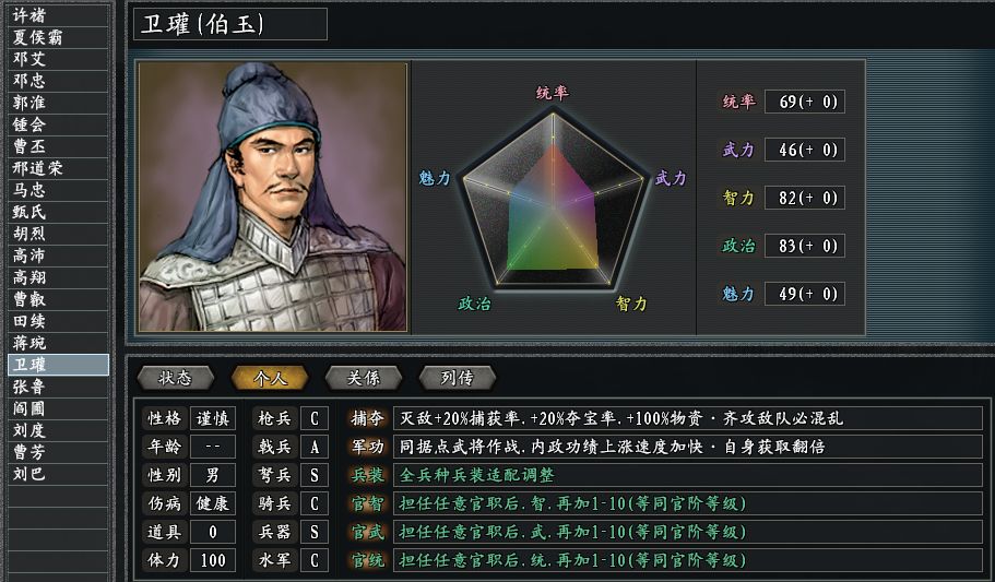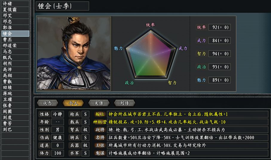 灭蜀三功臣邓艾、钟会和卫瓘,都算得上是文武双全的狠人。邓艾善于屯田的特长,在三国志11惊鸿版里被粮神技能所彰显,他的友军部队只要击溃敌军,都能往其所在的城池里增添2000点粮食。邓艾的枪兵最为强力,其他精力则都放在了赚米上。相比之下,钟会更加善于带领器械部队,凭借神机营的效果,投石车攻击还可以引燃对手。不过鉴于钟会的叛立人设,君主曹丕最好与之同城,不然他可就要改旗易帜了。没有了捕缚技能的卫瓘,被捕夺做了替代。从功能上看,相当于融合了捕缚、掠夺和犄角,只是100%的抓人成功率被降到了20%,或许相当多的玩家会吐槽这个改变。
