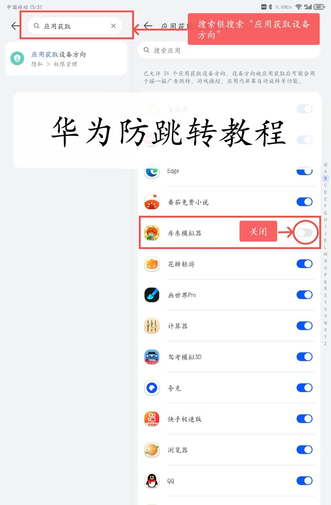 点击手机设置直接搜索应用获取设备方向,然后下拉找到房东模拟器进行关闭