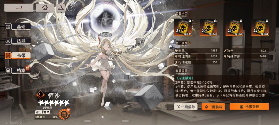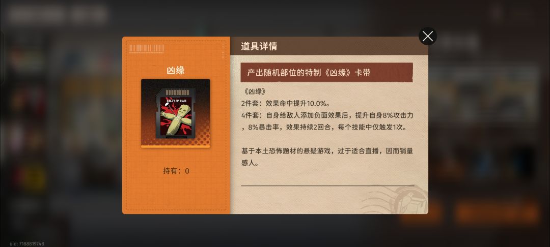 2、经摸索,本期效果命中为12%时仍有概率被抵抗debuff,效果命中为18%时未被抵抗。由于样本较少,参考boss抵抗为15%~20%。因此卡带需3条效果命中,或凶缘10%+一个词条;