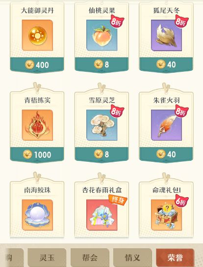 荣誉商城主要出售契灵培养相关的道具,尤其是契灵识海培养道具,仙桃灵果、狐尾天冬等,在荣誉商城购买最合适。