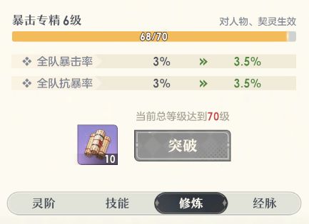 不少桃花师可能专注于提升角色部分而忽视了契灵,但是从资源利用效率上来说,均衡提升的收益是更高的。等级越高,提升需要的资源越多,而对人物、契灵都生效的暴击专精提升对总等级有要求,均衡提升可以用更少的资源,达到暴击专精提升的需求等级。