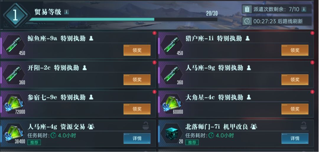 每天一共有5次贸易机会,定时回复,务必记得做完并且选取高奖励任务做,同时使用贸易特许令获得双倍奖励。此外,每个开拓进程开启时,还会有特殊贸易任务刷新,接取不占用每日贸易机会。
