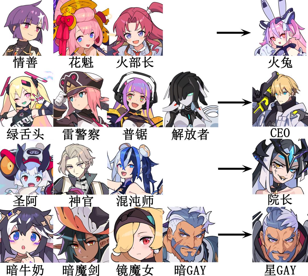 火属有情人节水善(情善)/黛妲莉亚(火部长)【其一必须】、菊野(花魁)→换丝缇涅尔(火兔)