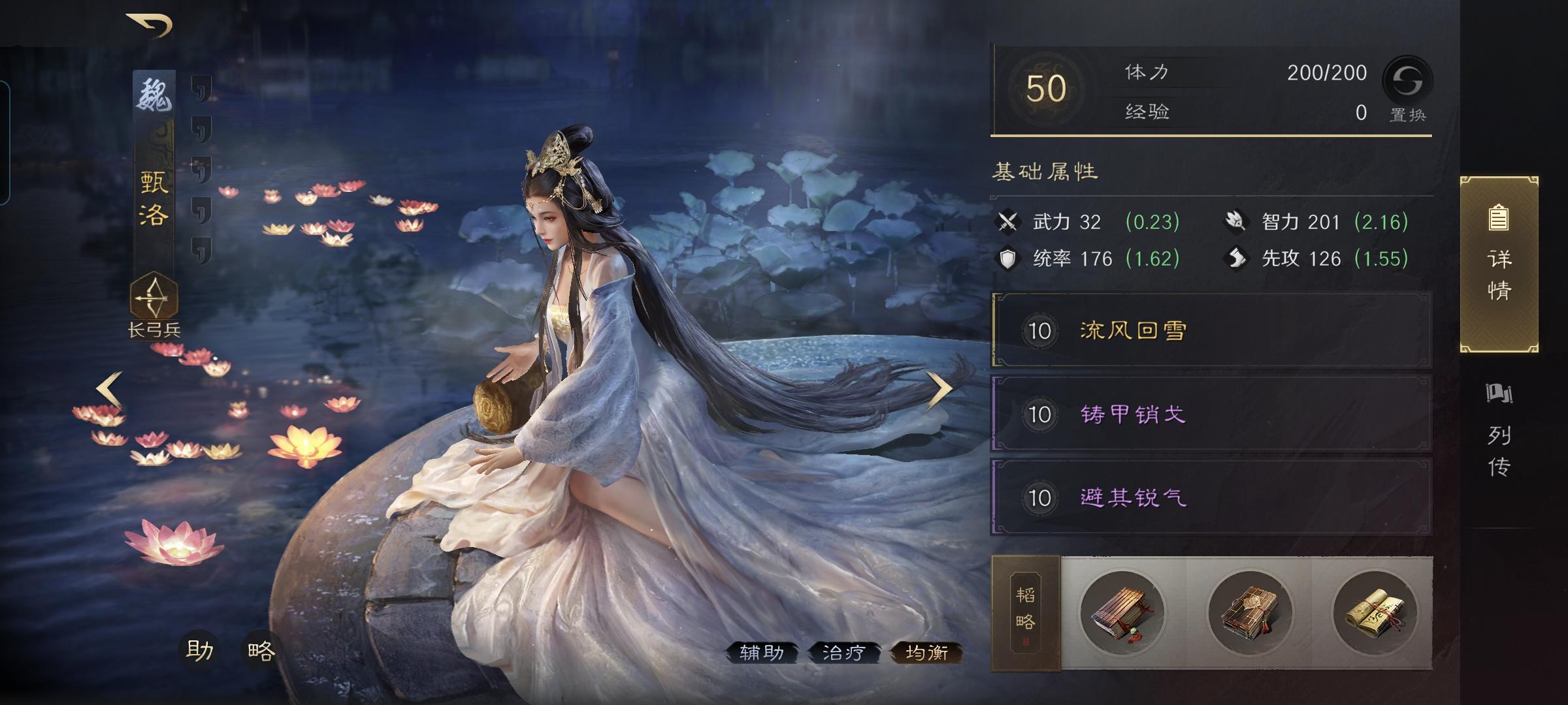 甄洛战法:流风回血+铸甲销戈+避其锐气。