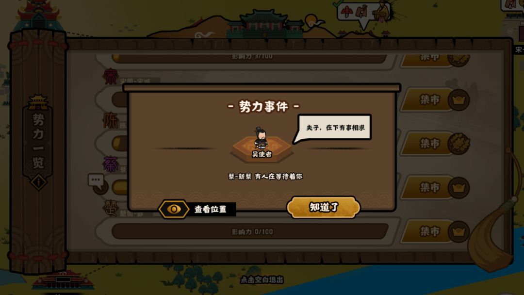 相信一定有王上好奇,那么除了让弟子出仕,还有没有其他方法提升影响力呢,答案自然是有的,除了招募弟子出仕外,在部分国家影响力达到15后,会触发对应的支线任务,完成支线任务也可以获得影响力。