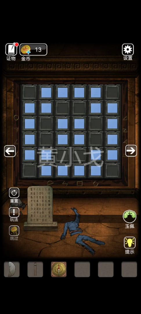 28.根据桌面上、合照上、陪葬品上和石柱上的篆体符号及颜色,按下对应的符号按钮,获得线索