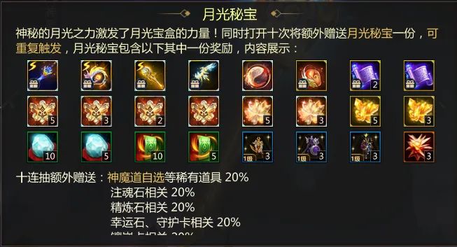 神秘月光之力激发宝盒力量,十连抽将额外赠送月光秘宝内的道具1份,各种稀有道具加倍带走!