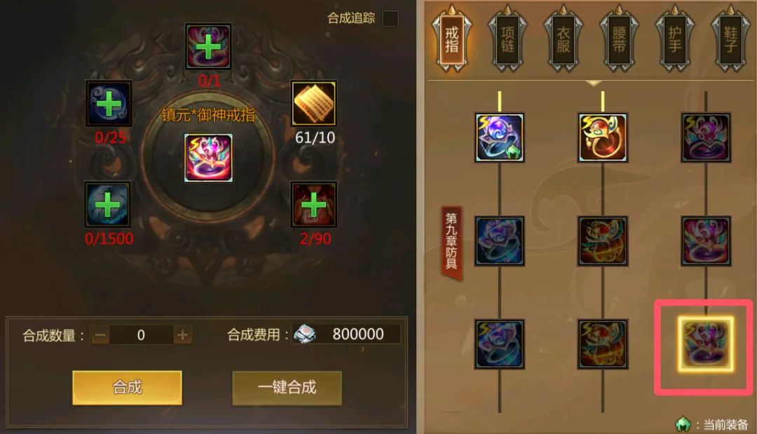 合成材料:对应九章生存防具+神之防具打造书页+冲锋战魂+第九章装备精元+雪猞绒