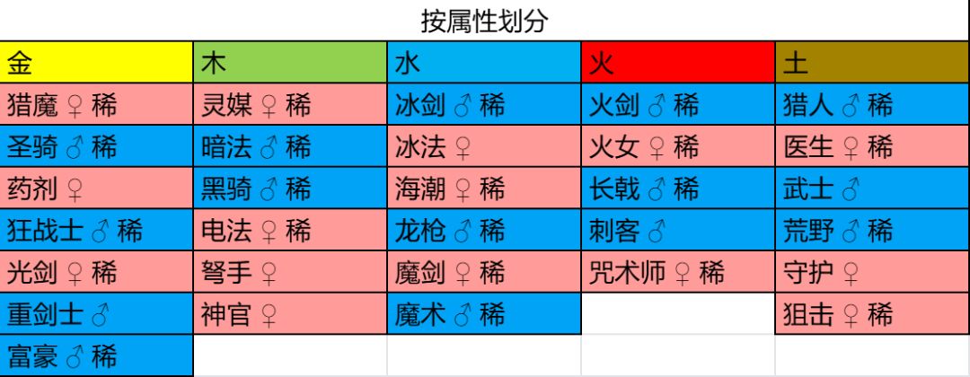每个表格从上往下,是我个人认为的各个组别之中按常用程度排序的,比如金属性猎魔、药剂、圣骑、狂战都是遗忘常客,单属性队的情况下基本也就这四位排列组合。