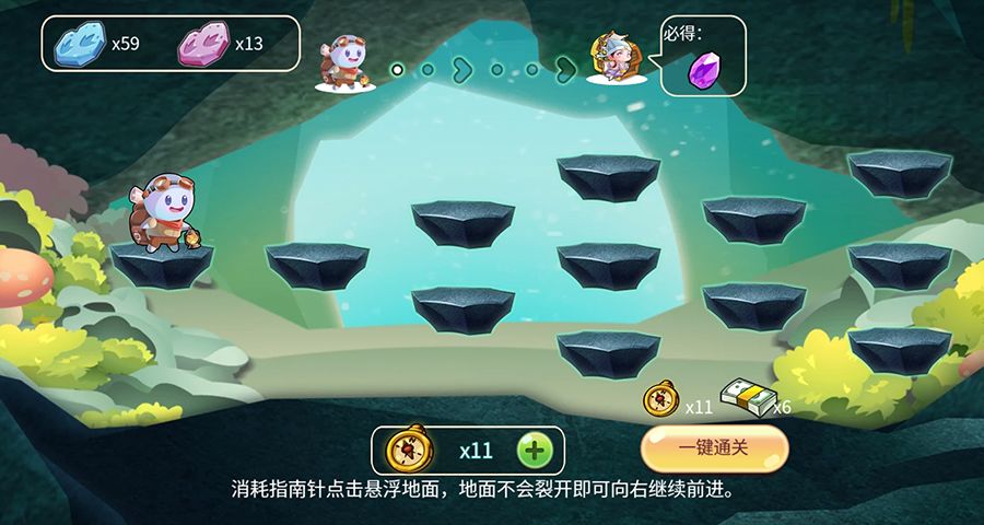 到达关底,使用收集到的指南针向前进,通关可获得丰富奖励!