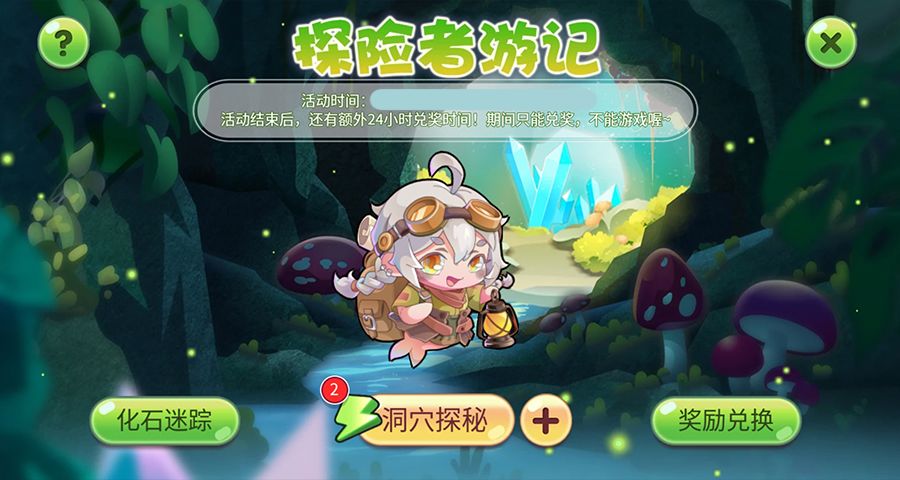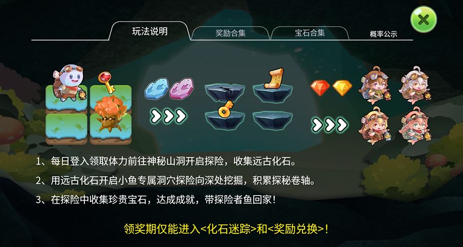 1、本活动分为三部分:洞穴探秘、化石迷踪、奖励兑换;
