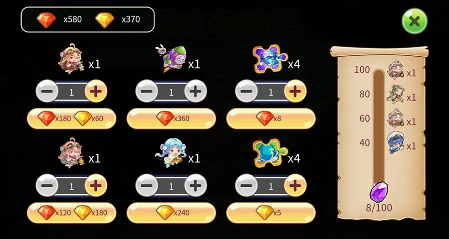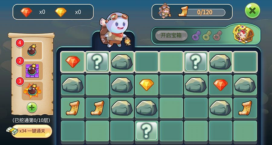 努力完成每层的探险事件,收集卷轴、宝石,收集三色钥匙开启大宝箱!