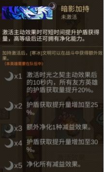 升级到100级后可以刷到三挡的专属,每个专属可以强化3级契约加持。凑齐光暗加持理论上需要2个光明加持和2个暗影加持的三档专属,因为光暗加持是可以同时生效的。所以纯文明队伍为: