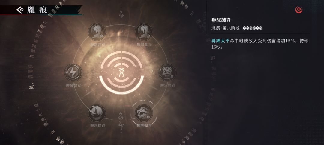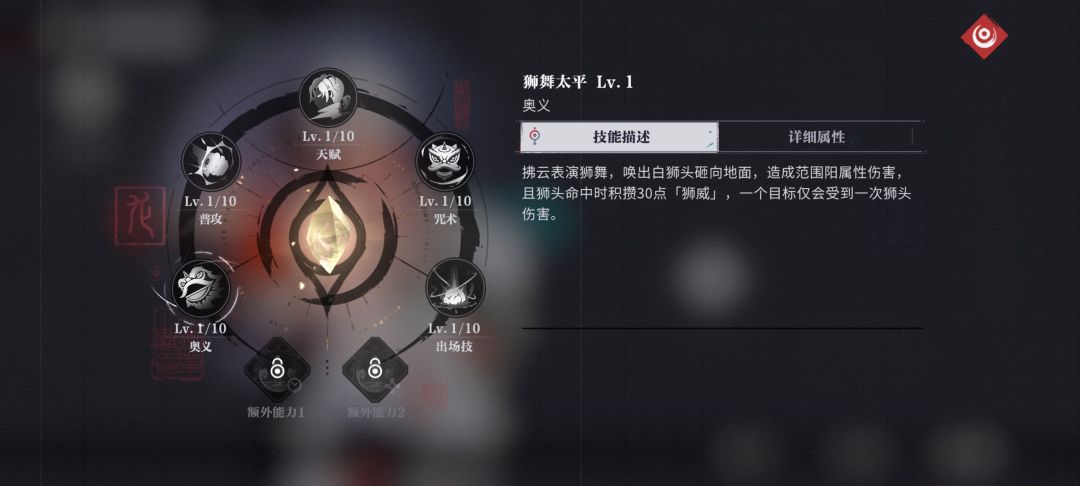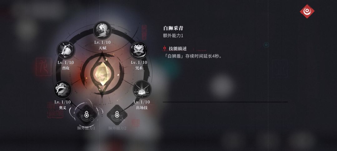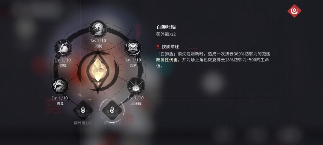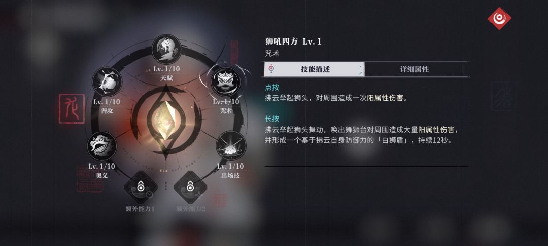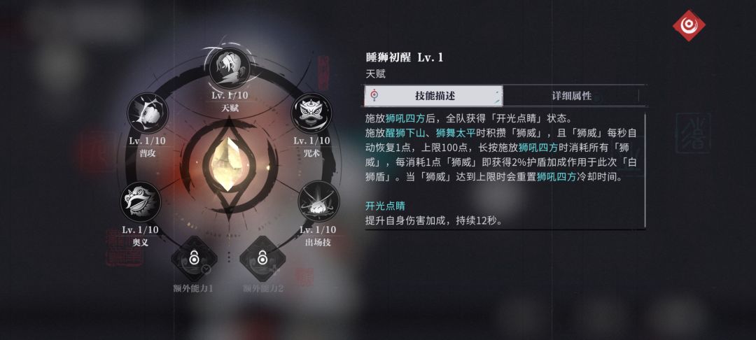 使用咒术使全队进入[开光点睛]状态获得28%的增伤,并且释放出场技、奥义会积攒[狮威],狮威每秒自动回复1点,上限100点,长按咒术时消耗[狮威]每消耗1点获得2%的护盾加成上限200%,当狮威满时重置咒术CD!