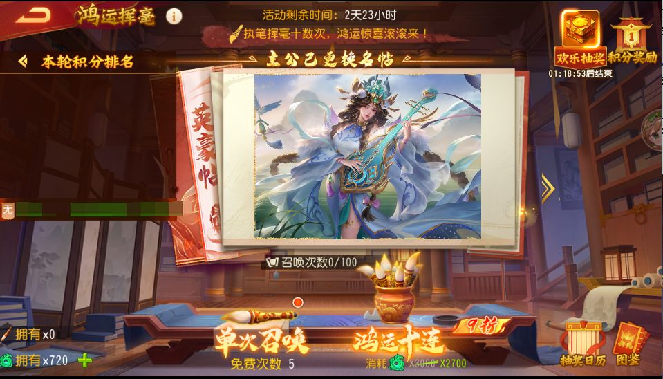 2、在抽奖开启期间,只要主公进行过1次挥毫,就能自动获得本轮抽奖的参与资格,挥毫次数越多,中奖概率越大;